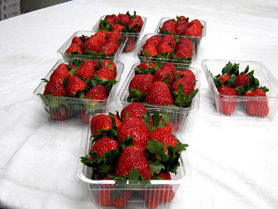 基本的には1パックに300gのいちごを詰めて出荷を行っております。実の大きさによって3L、2L、L、M、Sとサイズ分けしてパック詰めを行い、それぞれ1パックに30g以上の実を10コ、20g〜29gの実を15コ、15g〜19gの実を20コ、・・と、重さ、個数も決まっております。(大きな実に関しては入数にこだわらず、ある程度実の大きさを統一して、重さだけでパック詰めをし、販売する場合もあります。写真はこのパターンで、大きさは2Lサイズ)