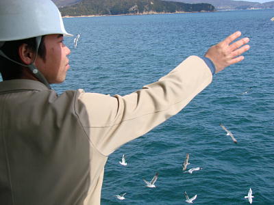 内海フェリーの乗組員さんが、カモメさんにエサを上げています。